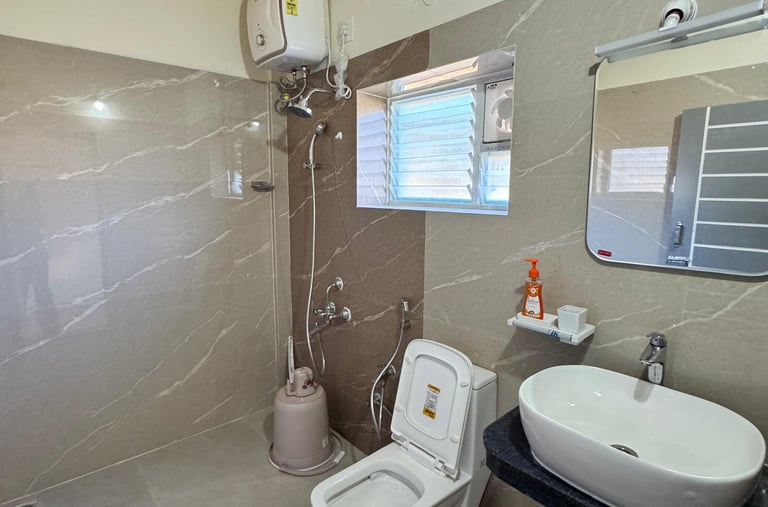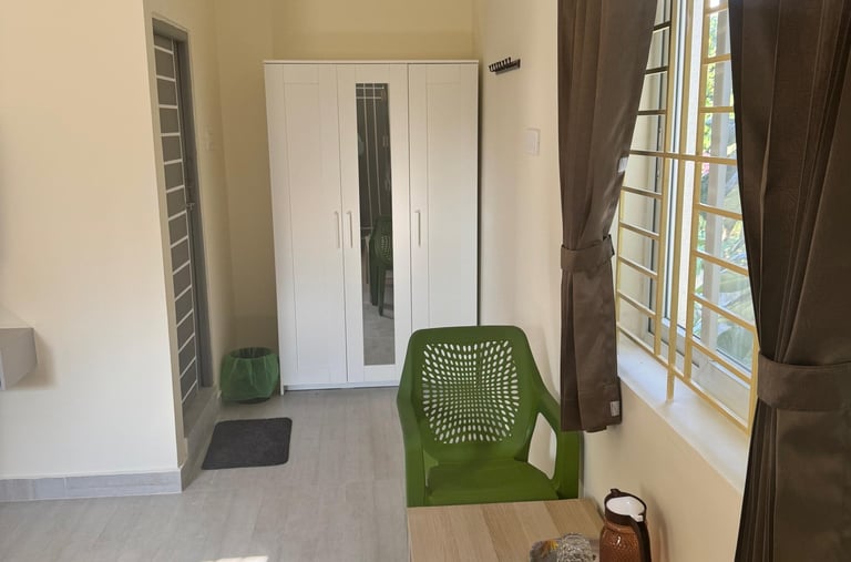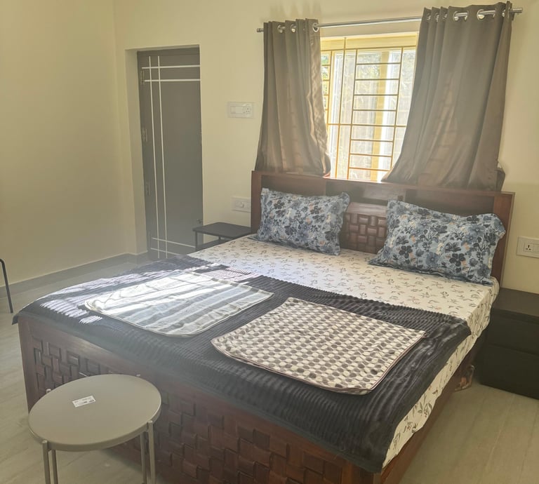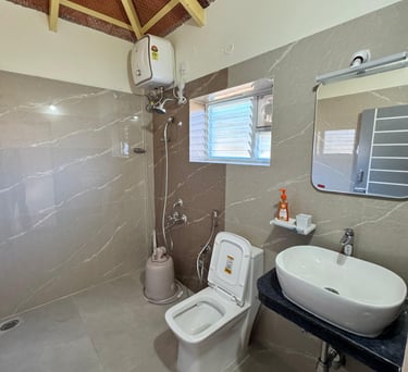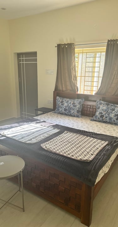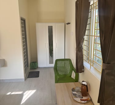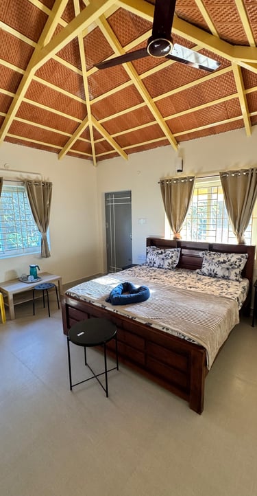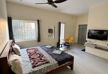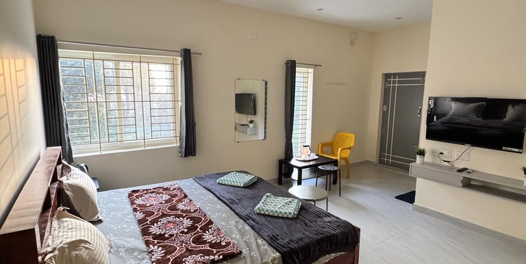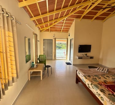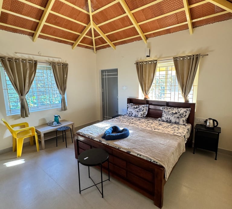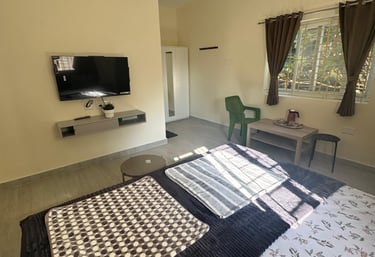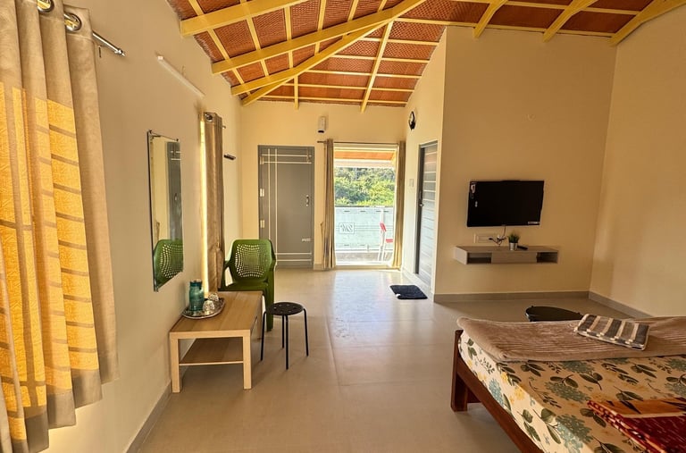 Spacious suite with private balcony offering serene views of Yercaud’s lush greenery, perfect for families seeking comfort.